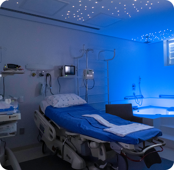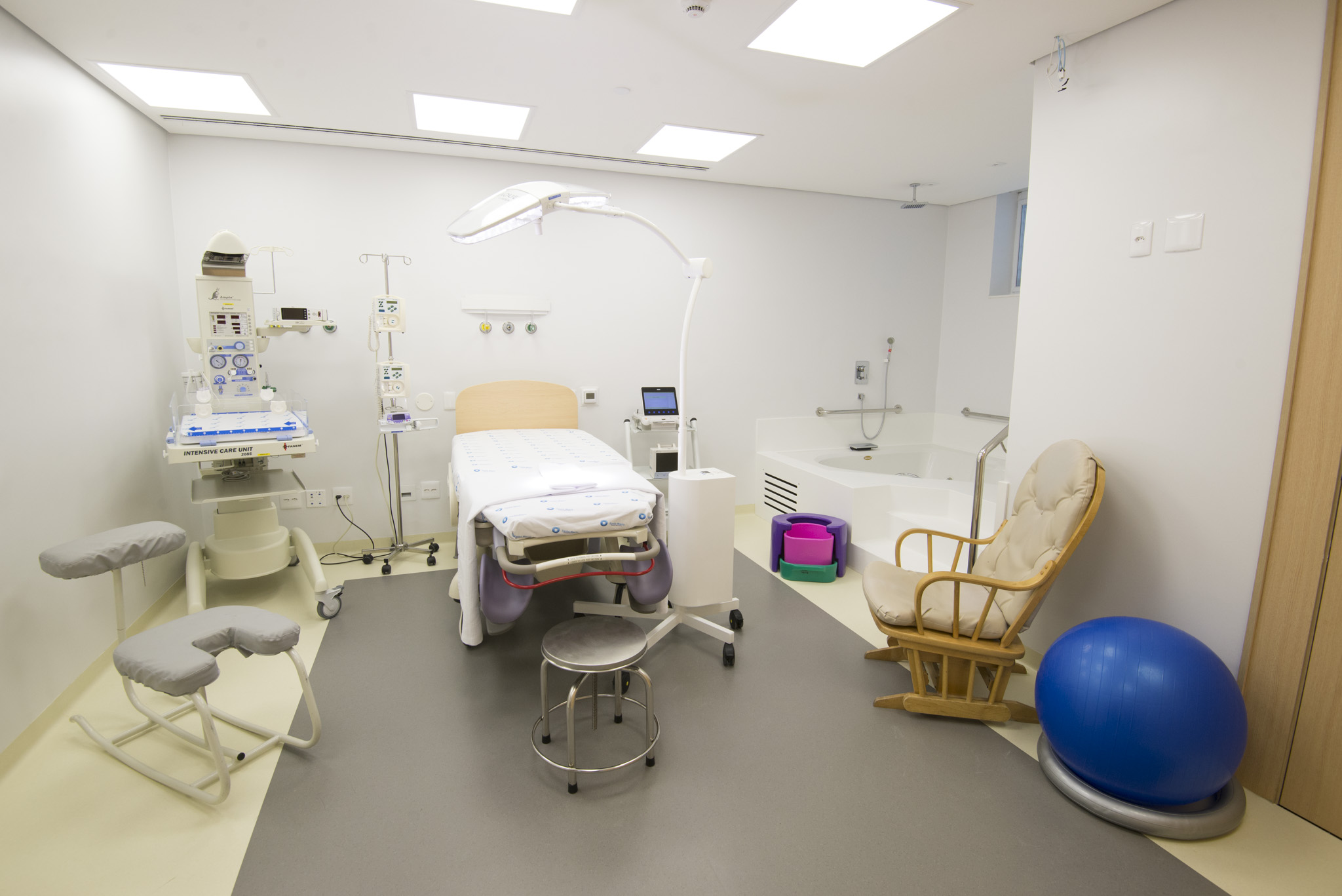 Temos um andar inteiro dedicado ao parto normal, com recursos que ajudam no trabalho de parto, como som ambiente, cromoterapia, bola de pilates, barra e banheira integrada